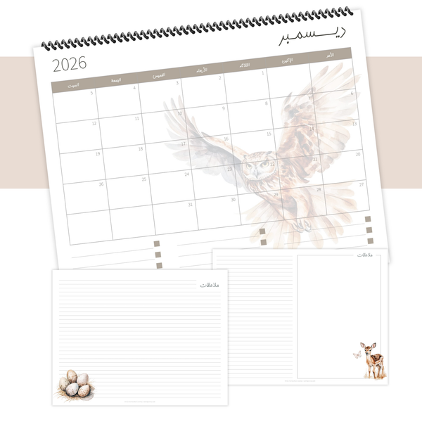 • 12 صفحة للشهور الميلادية، مع مساحة تحت التقويم لتدوين المهام والملاحظات